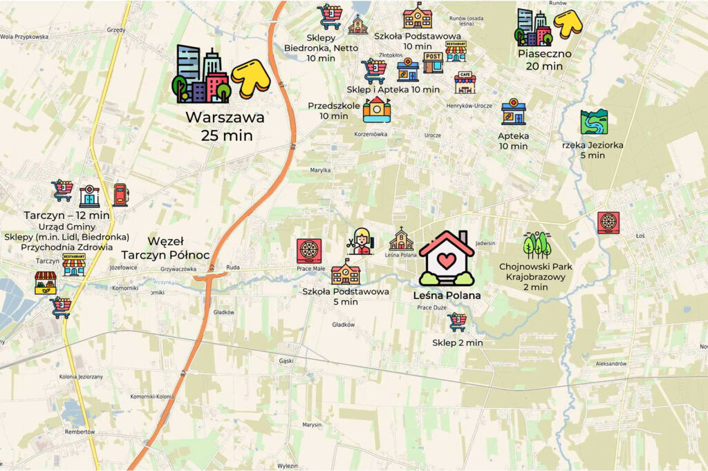 Dom położony jest w świetnej lokalizacji, która zapewnia szybki dostęp do kluczowych punktów miasta, takich jak szkoły, sklepy i tereny rekreacyjne, a także do głównych tras komunikacyjnych – w pobliżu trasy S7 i E77, zaledwie 5 minut od Węzła Tarczyn Północ oraz 24 minuty od Warszawy, co czyni to miejsce idealnym dla osób ceniących wygodę i doskonałe połączenia.
